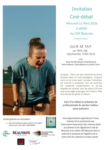 Dans le cadre de notre engagement en faveur de la prévention des violences, France Victimes 60 organise par un coportage avec la ville de Beauvais, la projection du film "Julie se tait", suivie d’un échange encadré par des intervenants professionnels avec le jeune public sportif présent, les adultes encadrants et le grand public.