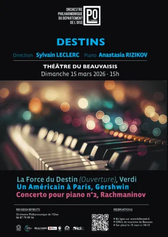 L’Orchestre Philharmonique de l'Oise vous invite à son concert de printemps « Destins » : un programme riche et émouvant mêlant des grandes pages du répertoire symphonique : La Force du destin de Verdi, Un Américain à Paris de Gershwin, et le Concerto pour piano n°2 de Rachmaninov, porté par la talentueuse pianiste Anastasia Rizikov. ![]()