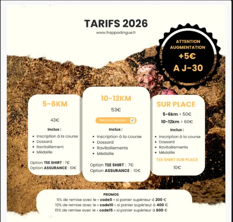 - Arrivée: le village Frappadingue t’accueillera avec un espace détente, ravitaillement et un « PhotoWall » pour immortaliser ton expérience avec tes amis!