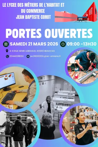 Le samedi 21 mars 2026 à 09h Le Lycée Jean-Baptiste Corot à Beauvais organise sa journée portes ouvertes le 21 Mars 2026 de 9h à 13h30. Catégories : Emploi, insertion professionnelle Familles Site du Lycée Jean-Baptiste Corot S'inscrire Se connecter
