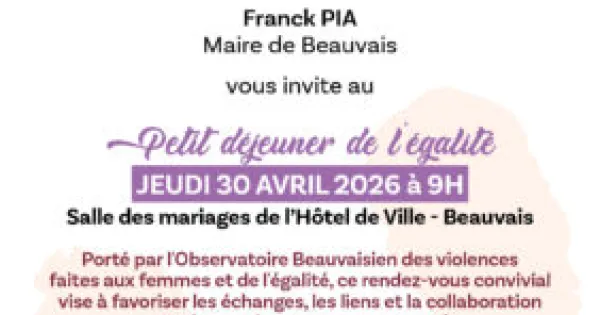 Chaque mois, la Ville de Beauvais donne rendez-vous aux forces vives du territoire. Le jeudi 30 avril à 9h, rejoignez le "Petit Déjeuner de l’Égalité" à l’Hôtel de Ville pour renforcer la lutte contre les violences faites aux femmes et bâtir des projets communs.