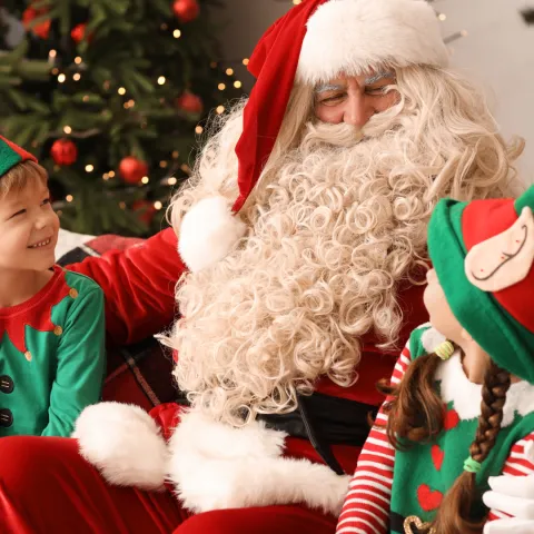 Retrouvez le Père Noël en compagnie de ses lutins. Confortablement installé dans son fauteuil, il reçoit les enfants dans son chalet en bois.